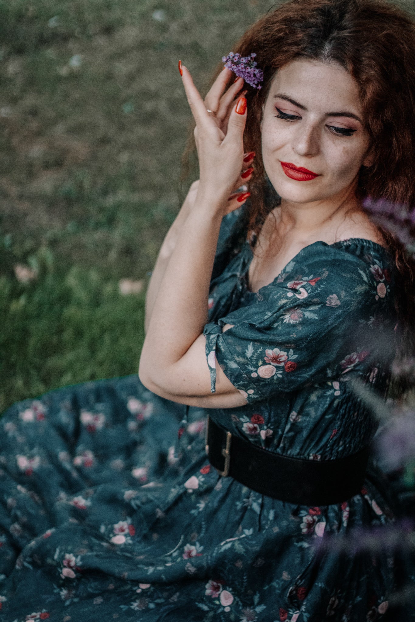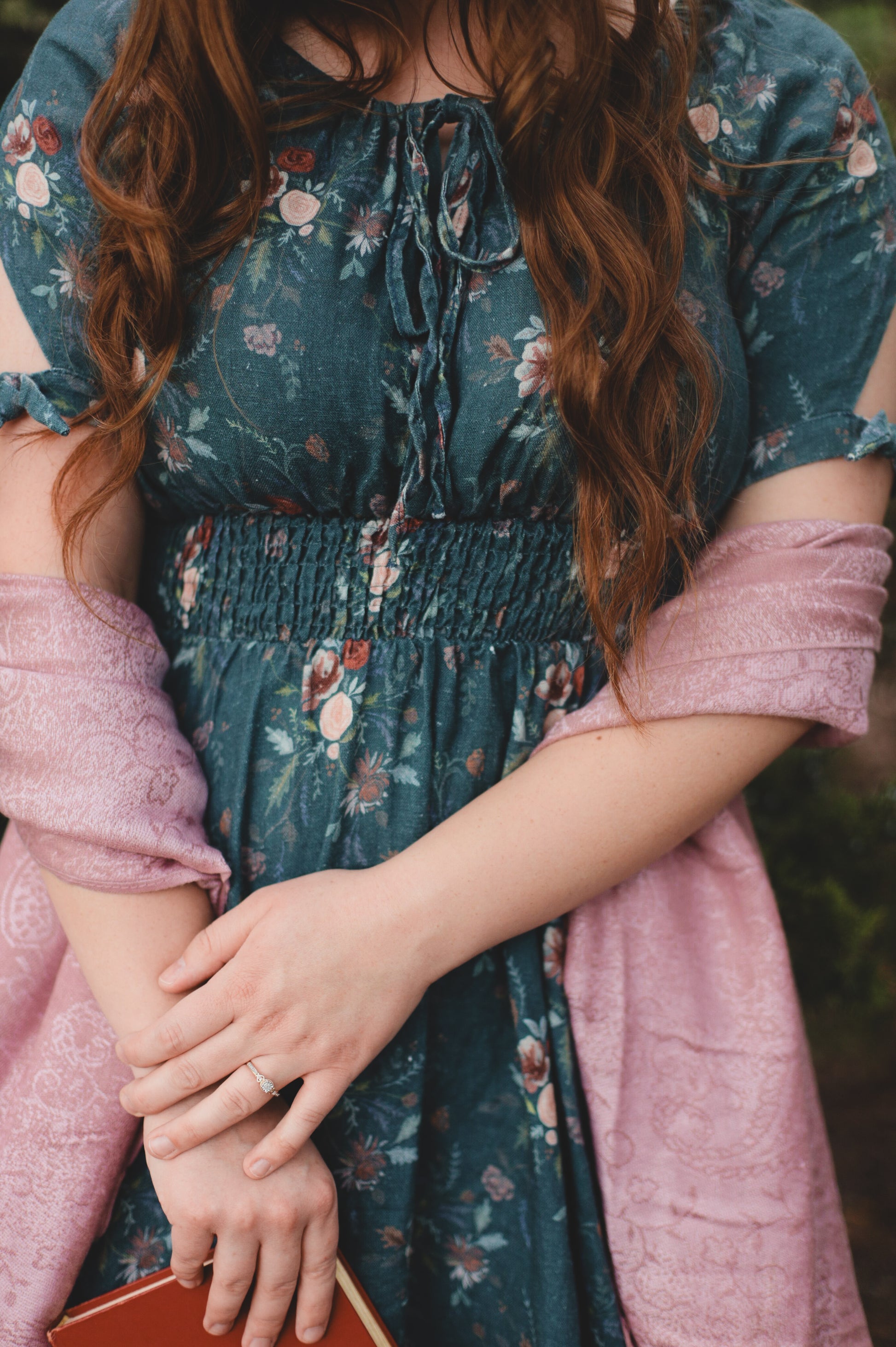 Soft russett roses, dusky leaves, and deep lavender sprigs bloom gently across a deep teal background- like pressed petals scattered on a page. 🌹🍂