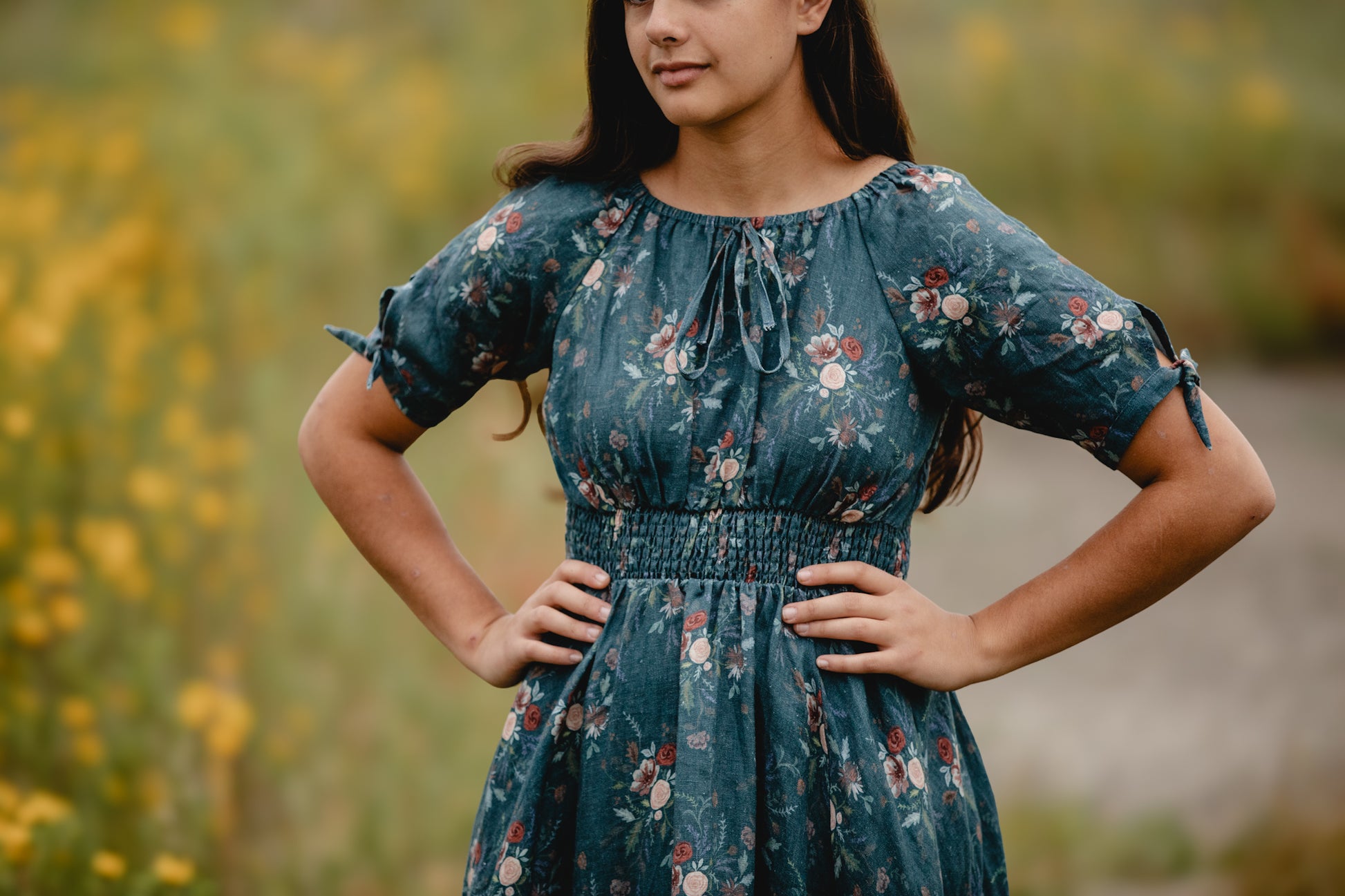 • Smocked waist in the front (vertically wider) and fully smocked bodice and waist in the back