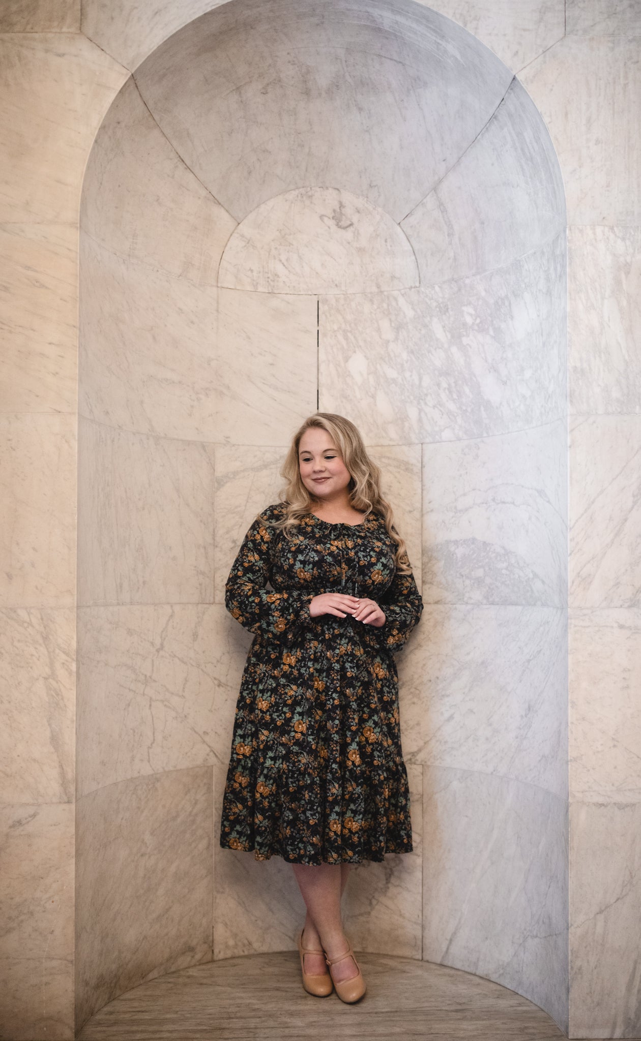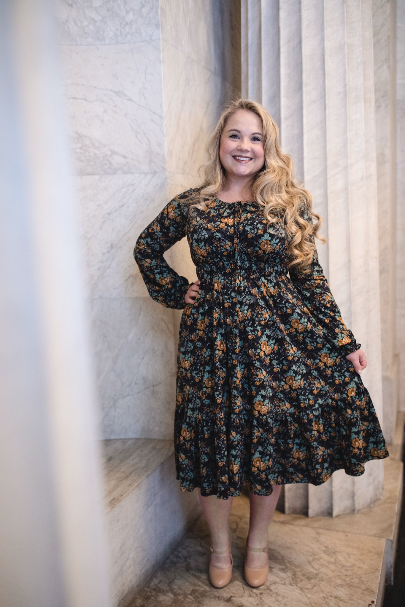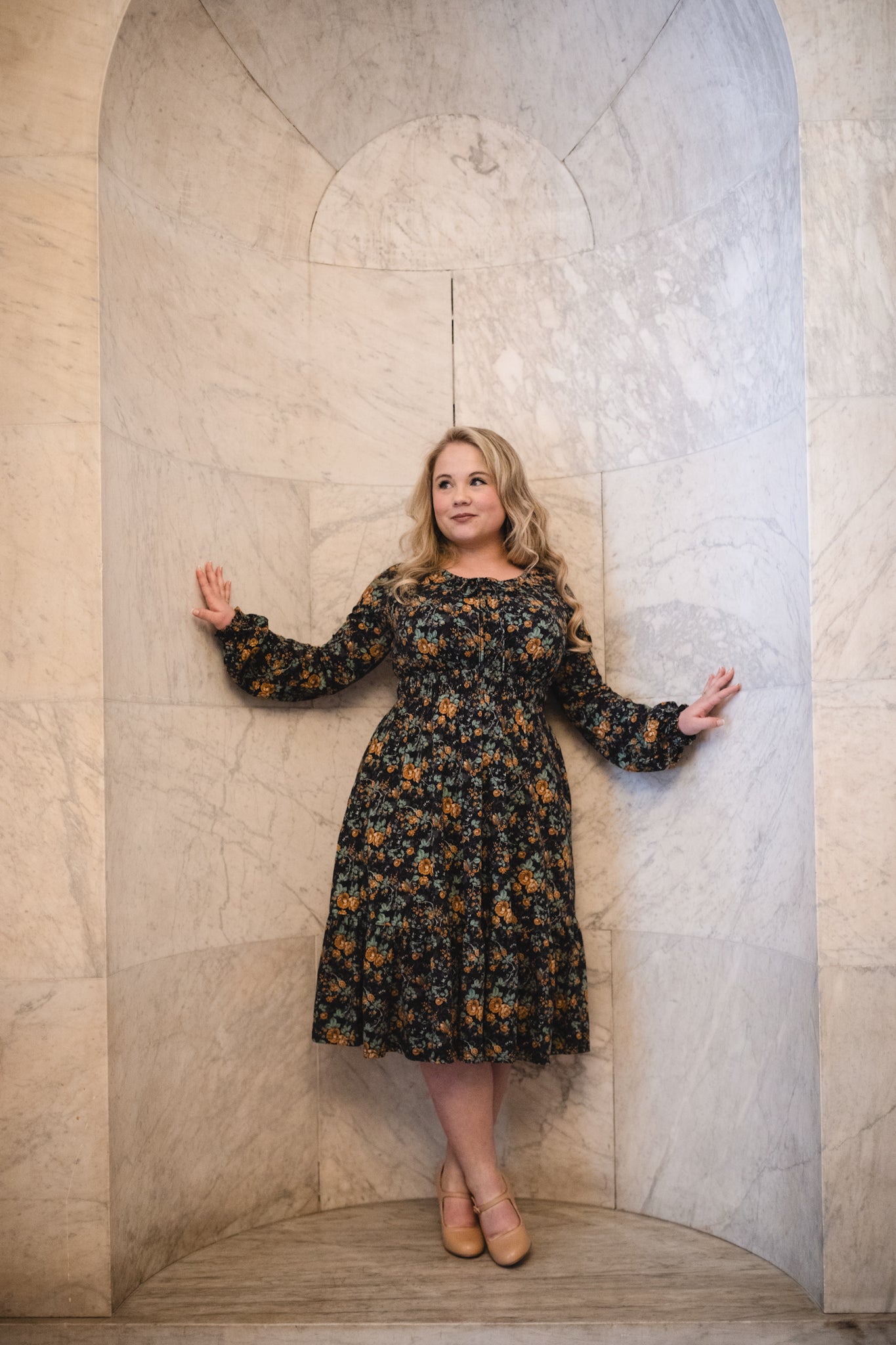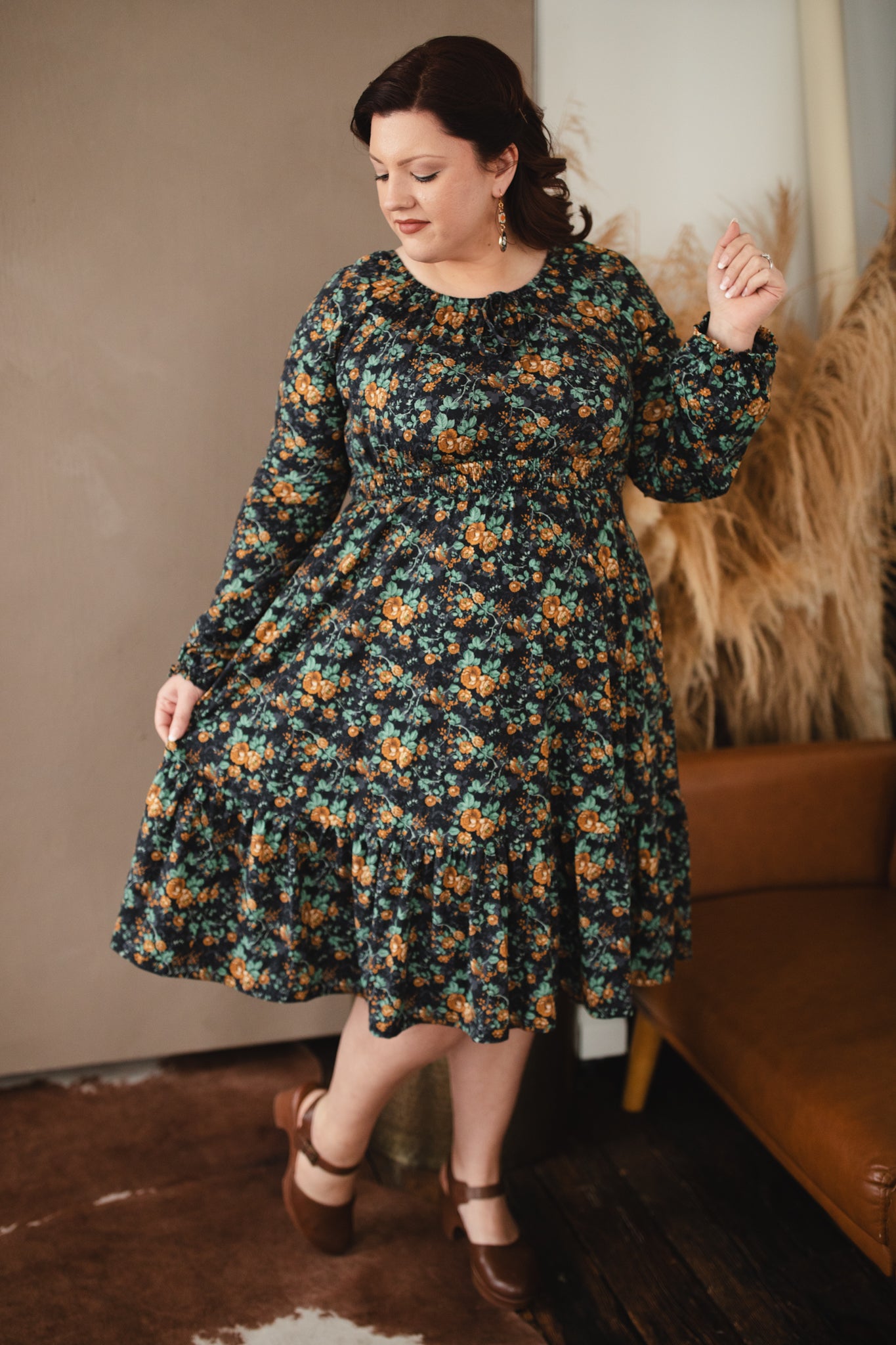 Set against a deep black backdrop, Amber Eclipse blooms with golden florals, stenciled-look secondary background, and soft emerald foliage, creating a rich, vintage-inspired contrast that feels both warm and dramatic. 💛 The jewel-toned palette adds depth and elegance, making this dress an effortless standout for winter days and candlelit evenings alike. 🕯Romantic and refined, it’s a timeless winter floral designed to glow all season long. 🌟