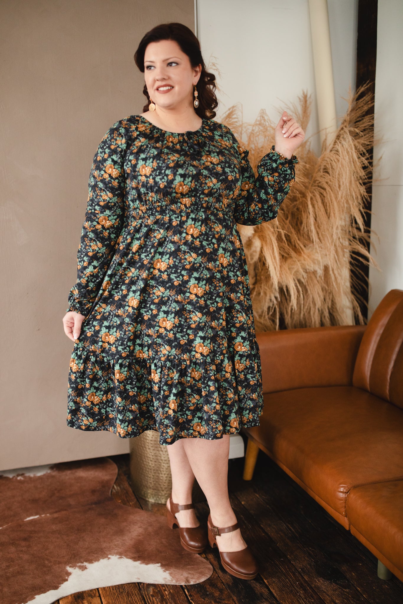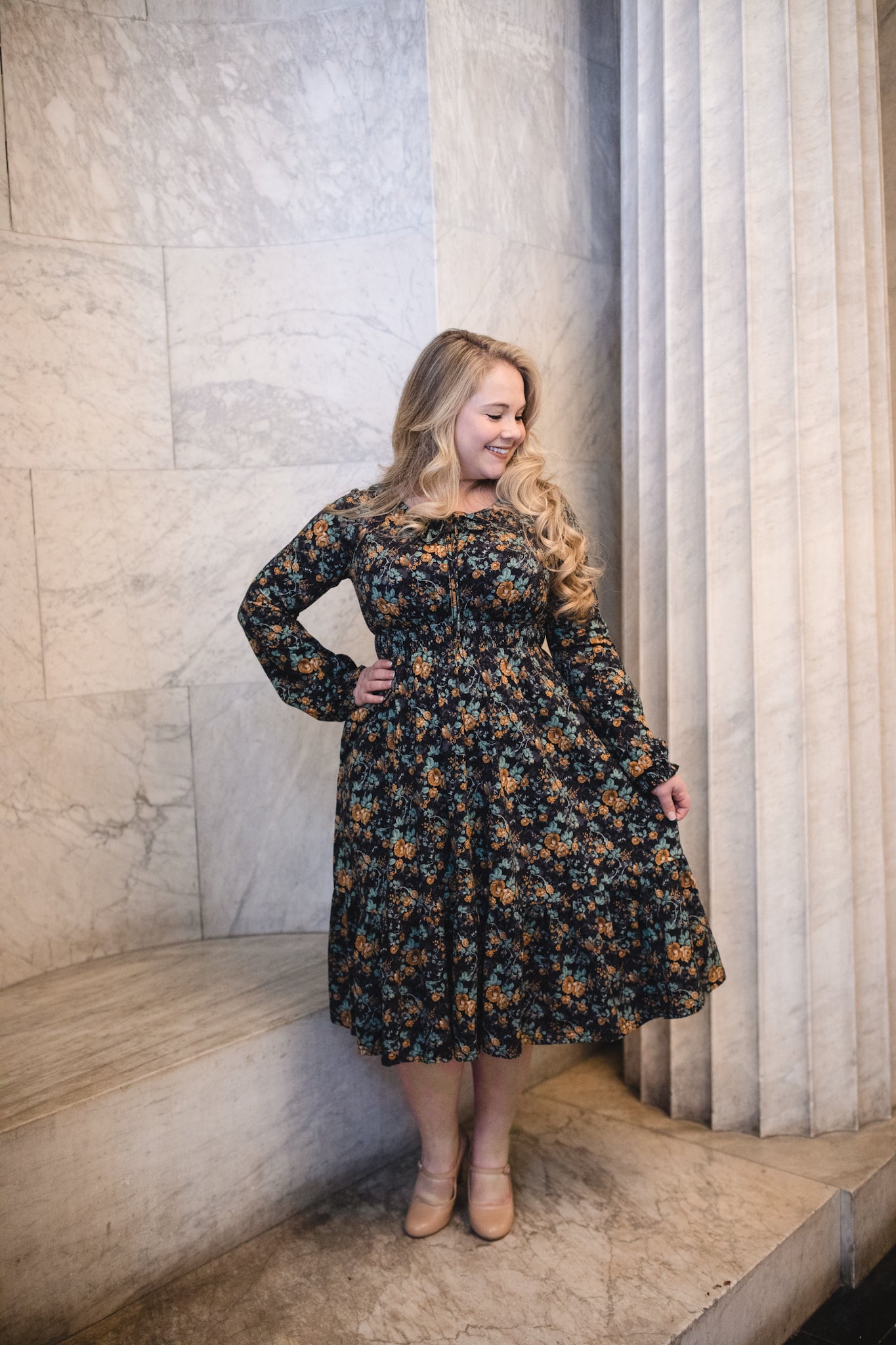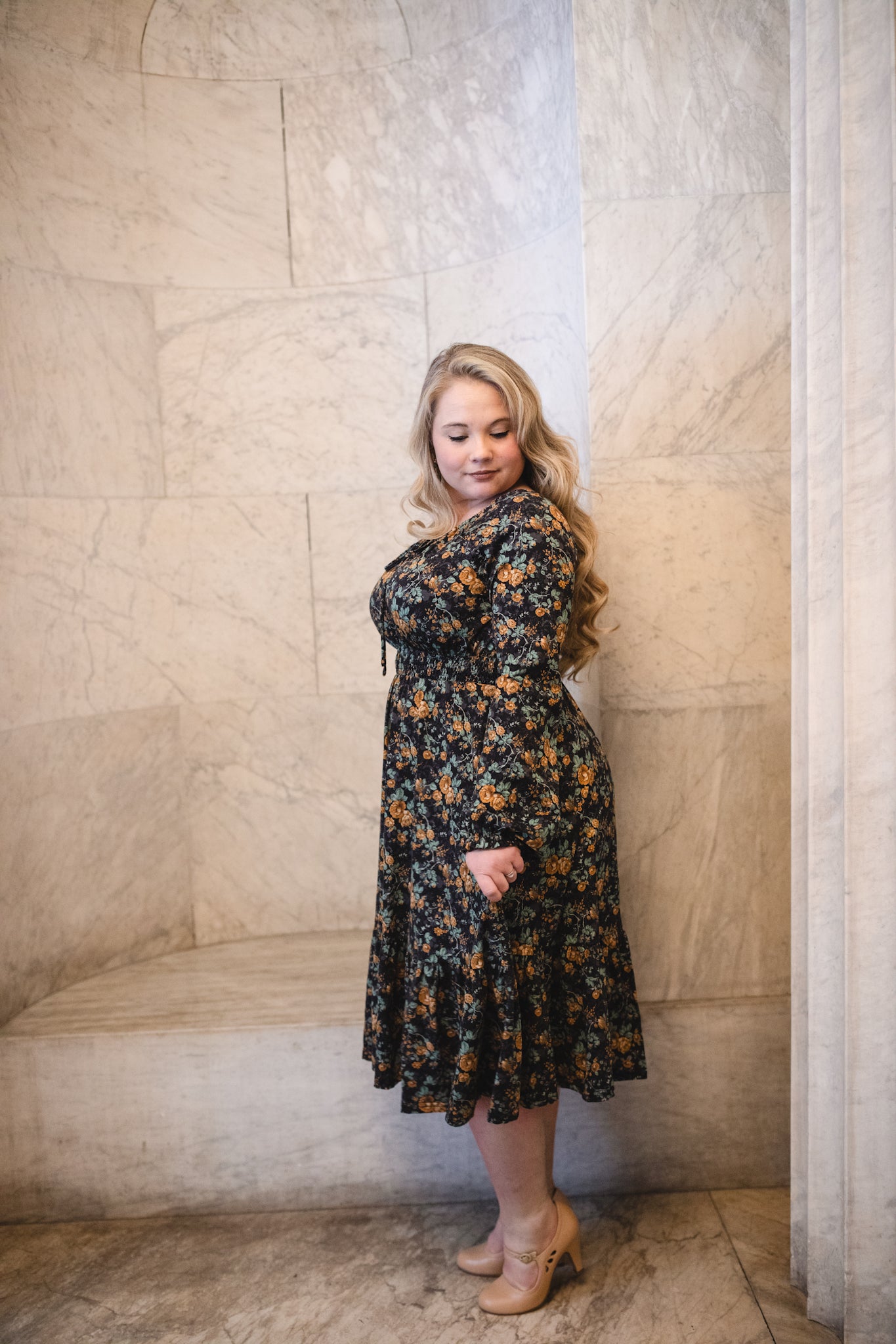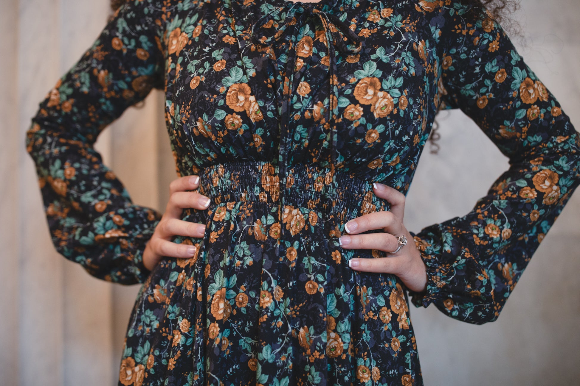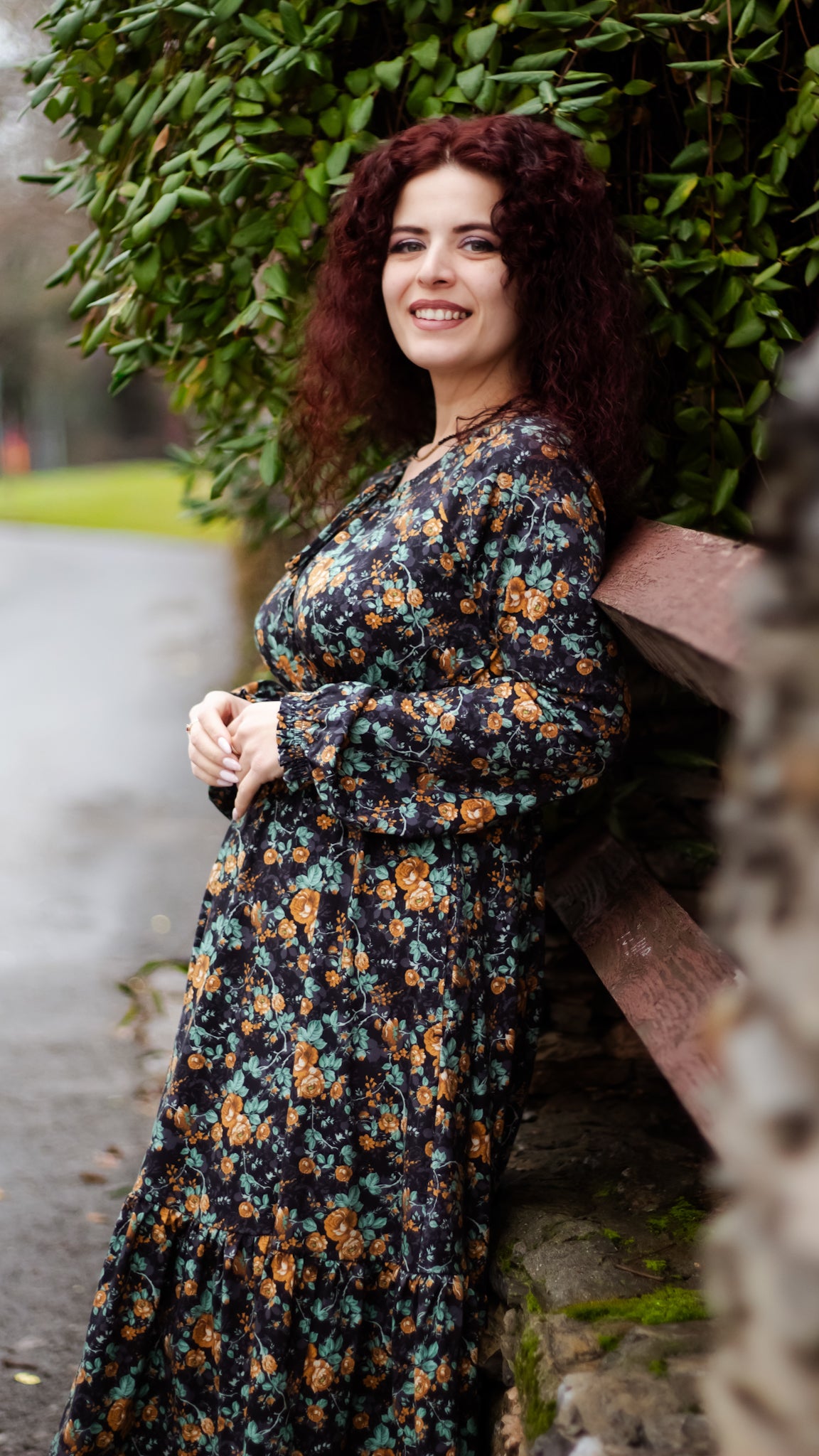 Set against a deep black backdrop, Amber Eclipse blooms with golden florals, stenciled-look secondary background, and soft emerald foliage, creating a rich, vintage-inspired contrast that feels both warm and dramatic. 💛 The jewel-toned palette adds depth and elegance, making this dress an effortless standout for winter days and candlelit evenings alike. 🕯Romantic and refined, it’s a timeless winter floral designed to glow all season long. 🌟