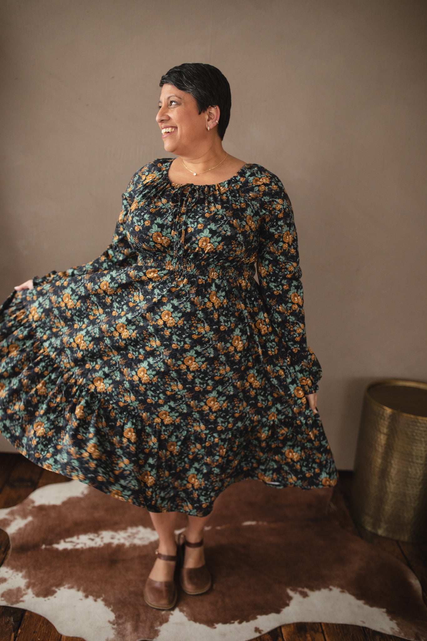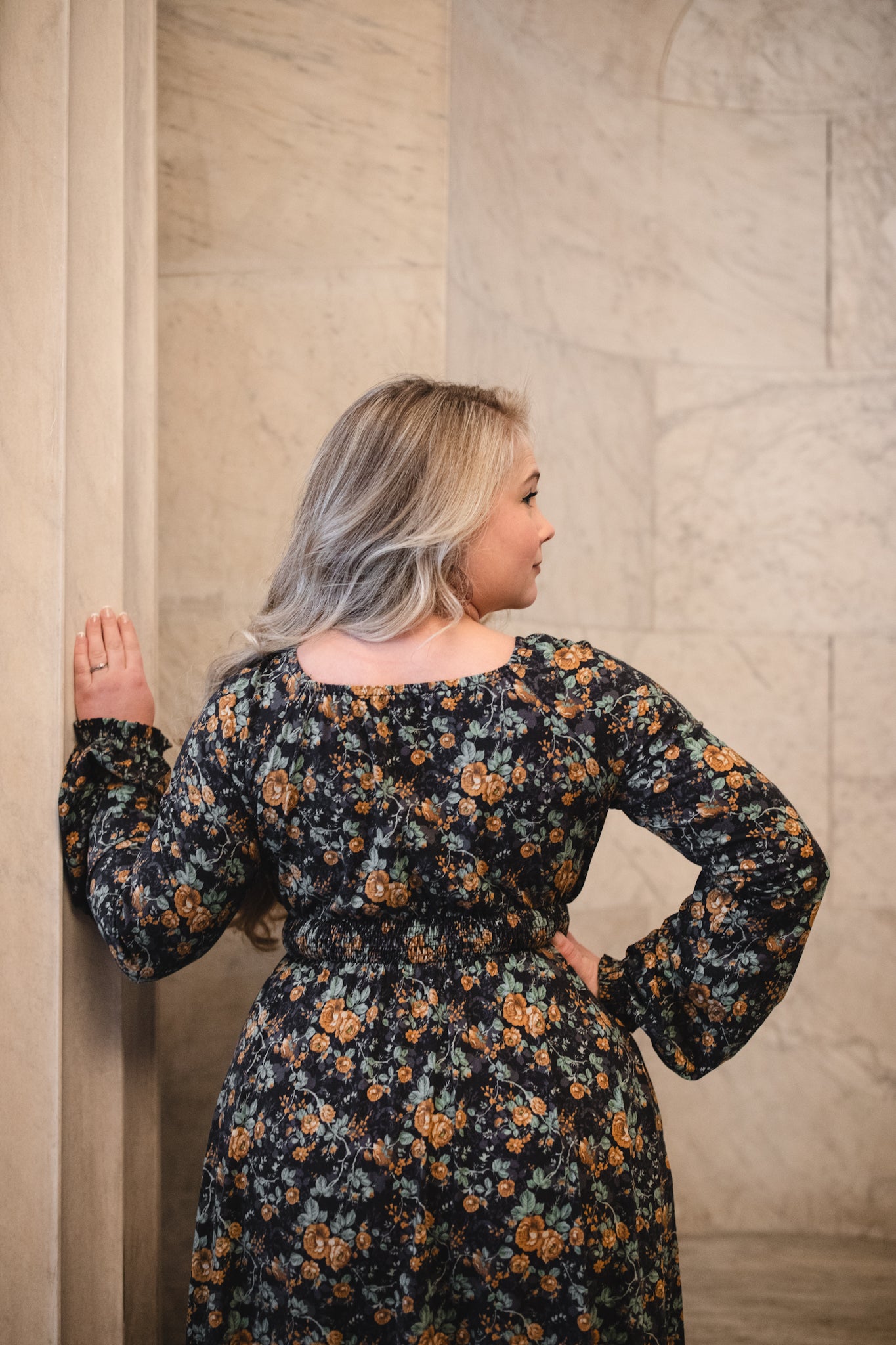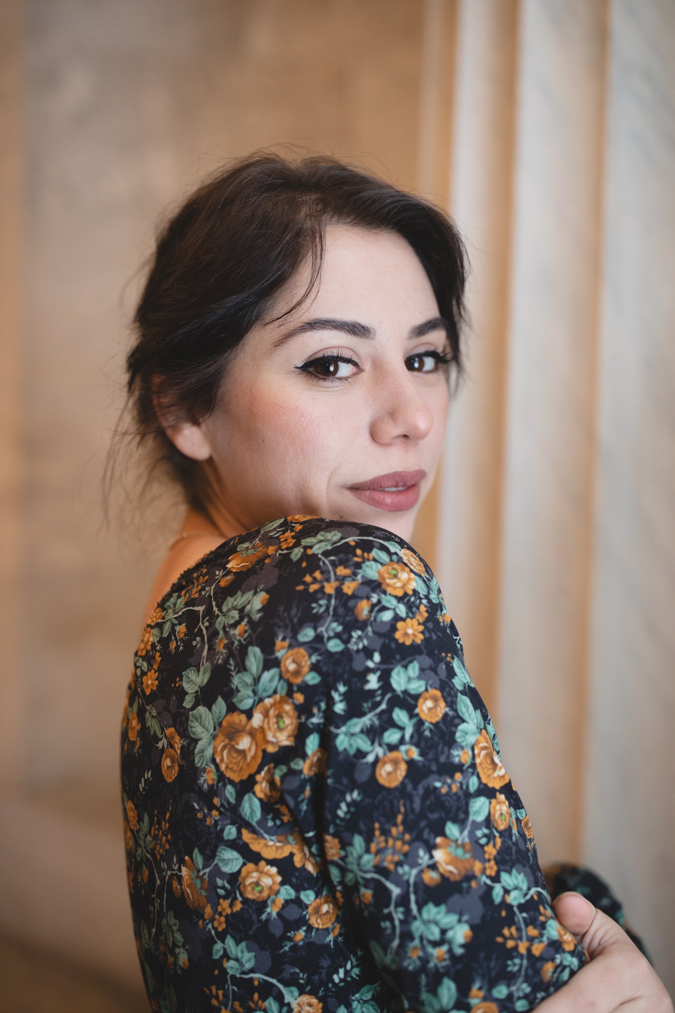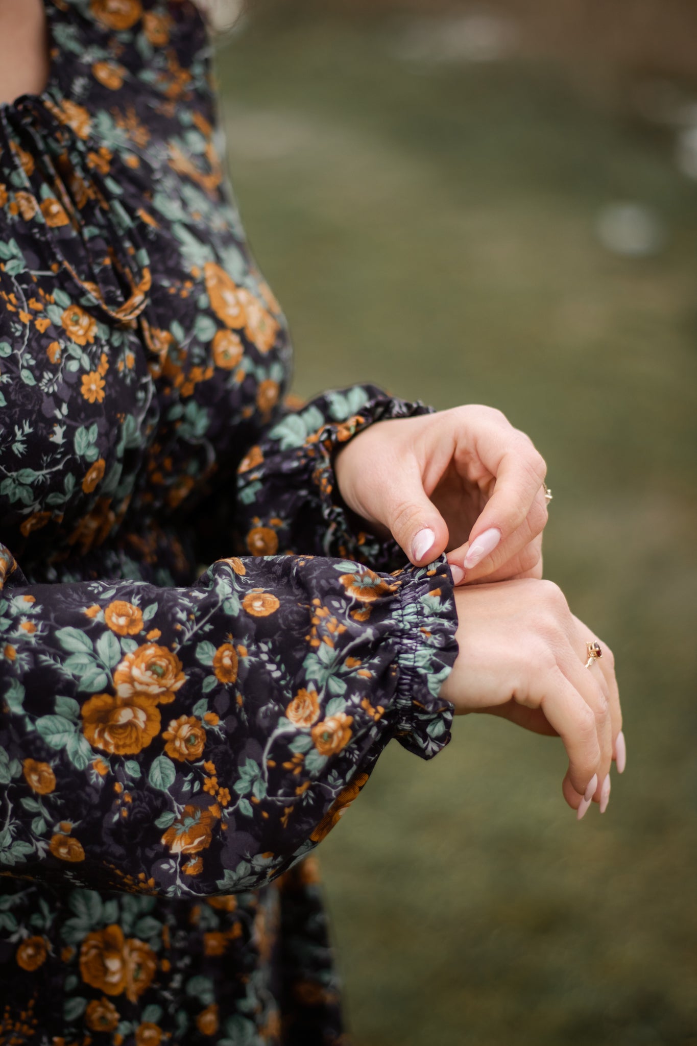 Set against a deep black backdrop, Amber Eclipse blooms with golden florals, stenciled-look secondary background, and soft emerald foliage, creating a rich, vintage-inspired contrast that feels both warm and dramatic. 💛 The jewel-toned palette adds depth and elegance, making this dress an effortless standout for winter days and candlelit evenings alike. 🕯Romantic and refined, it’s a timeless winter floral designed to glow all season long. 🌟