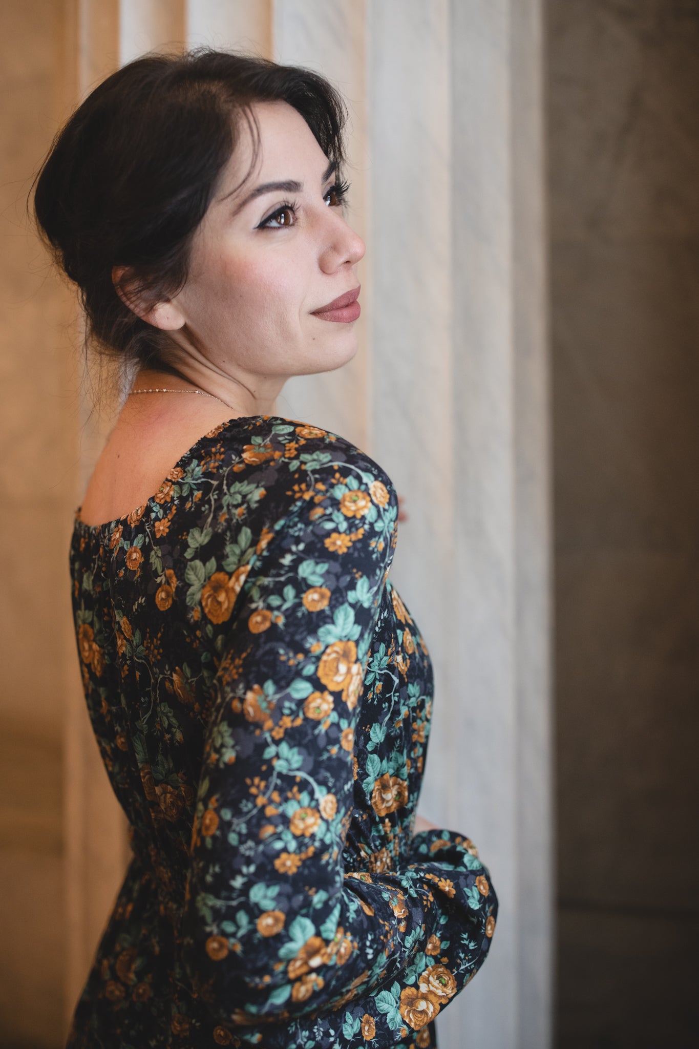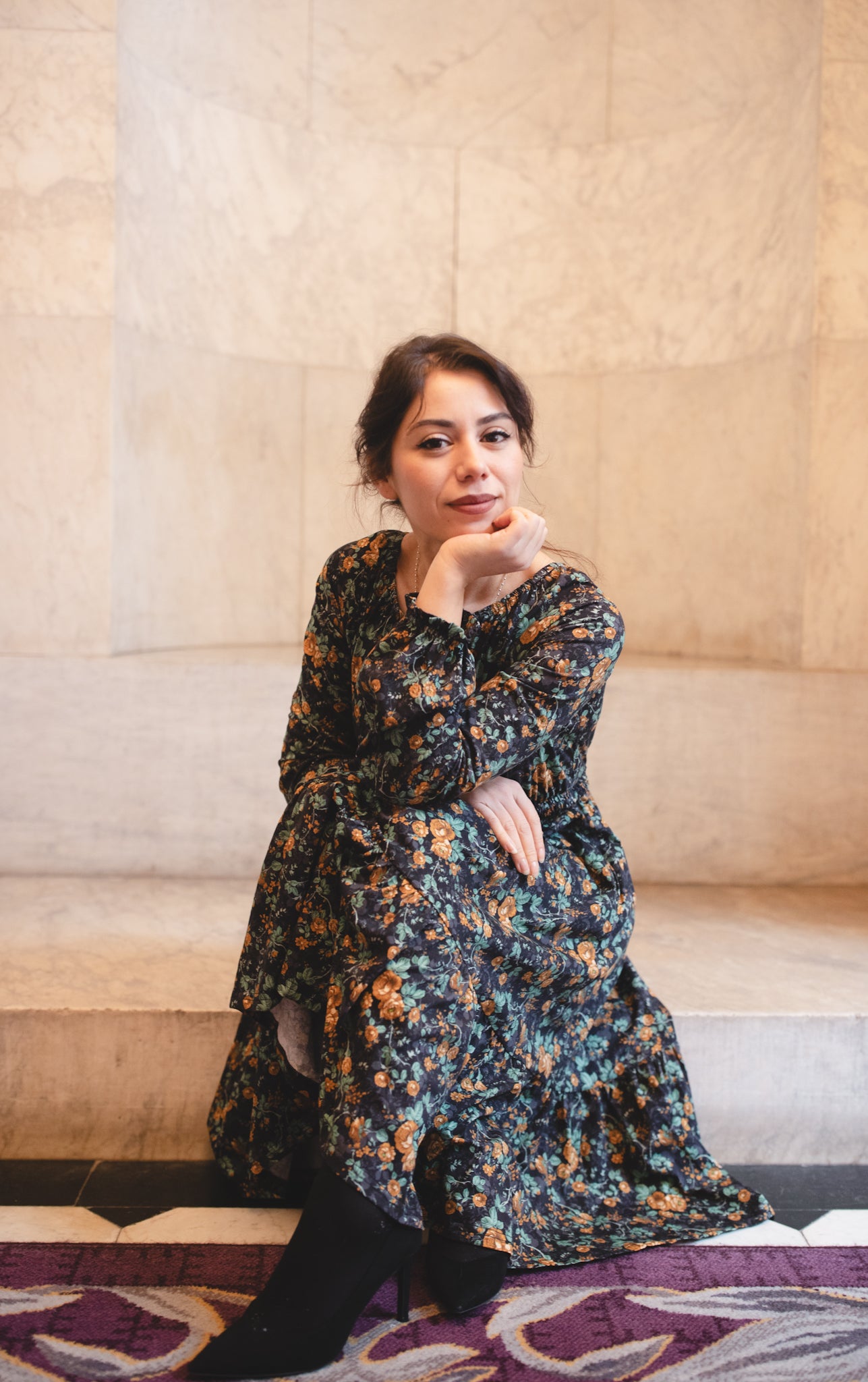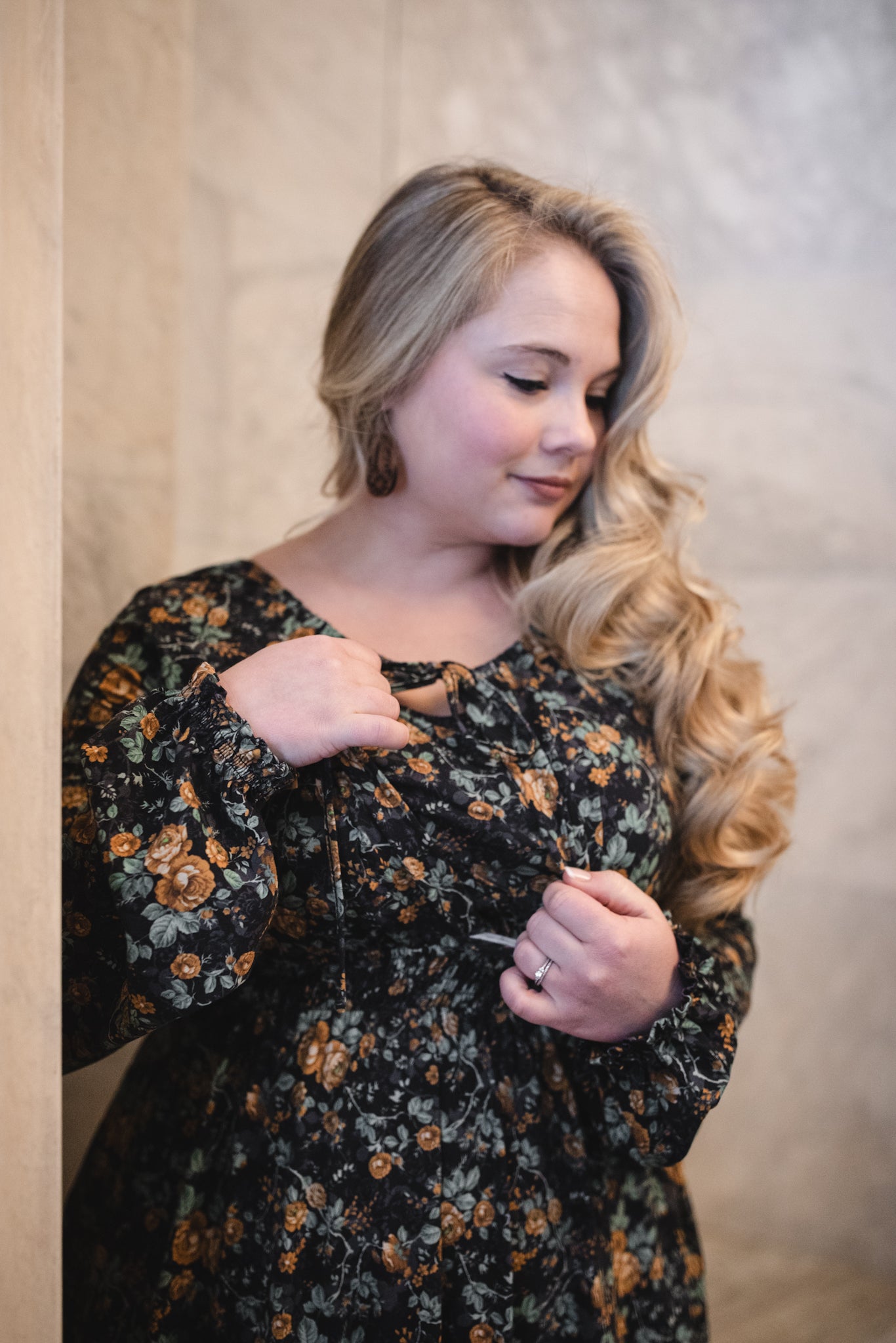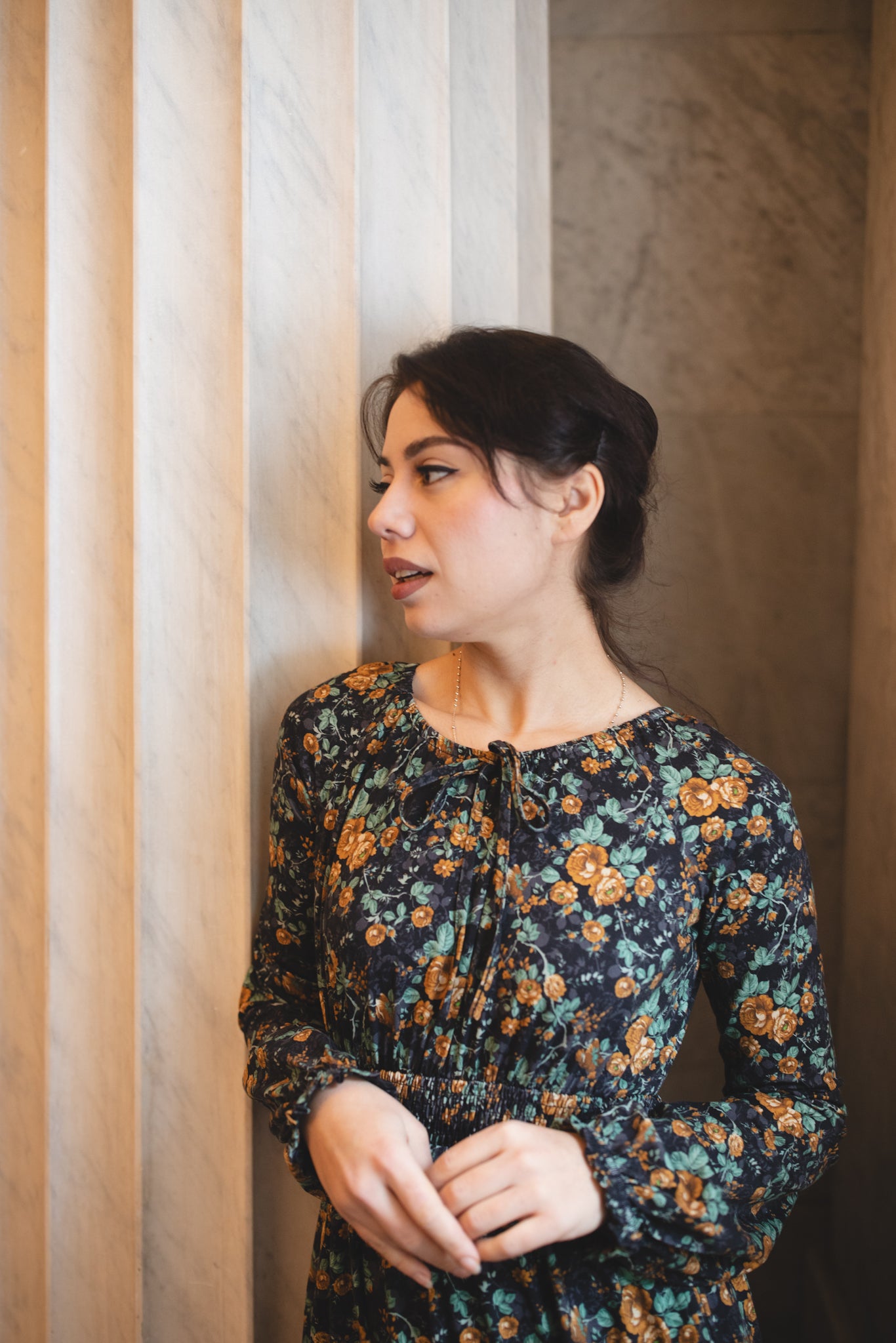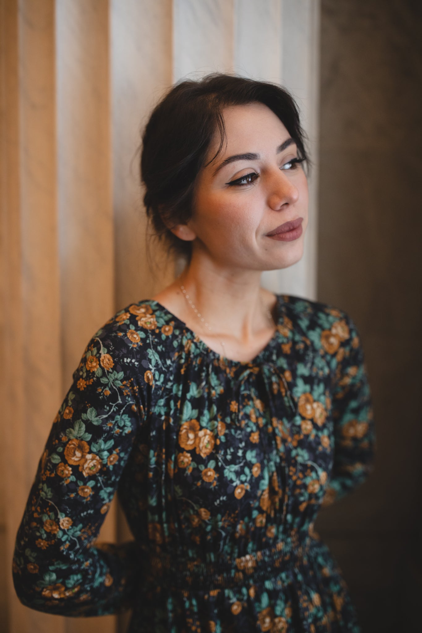 Set against a deep black backdrop, Amber Eclipse blooms with golden florals, stenciled-look secondary background, and soft emerald foliage, creating a rich, vintage-inspired contrast that feels both warm and dramatic. 💛 The jewel-toned palette adds depth and elegance, making this dress an effortless standout for winter days and candlelit evenings alike. 🕯Romantic and refined, it’s a timeless winter floral designed to glow all season long. 🌟